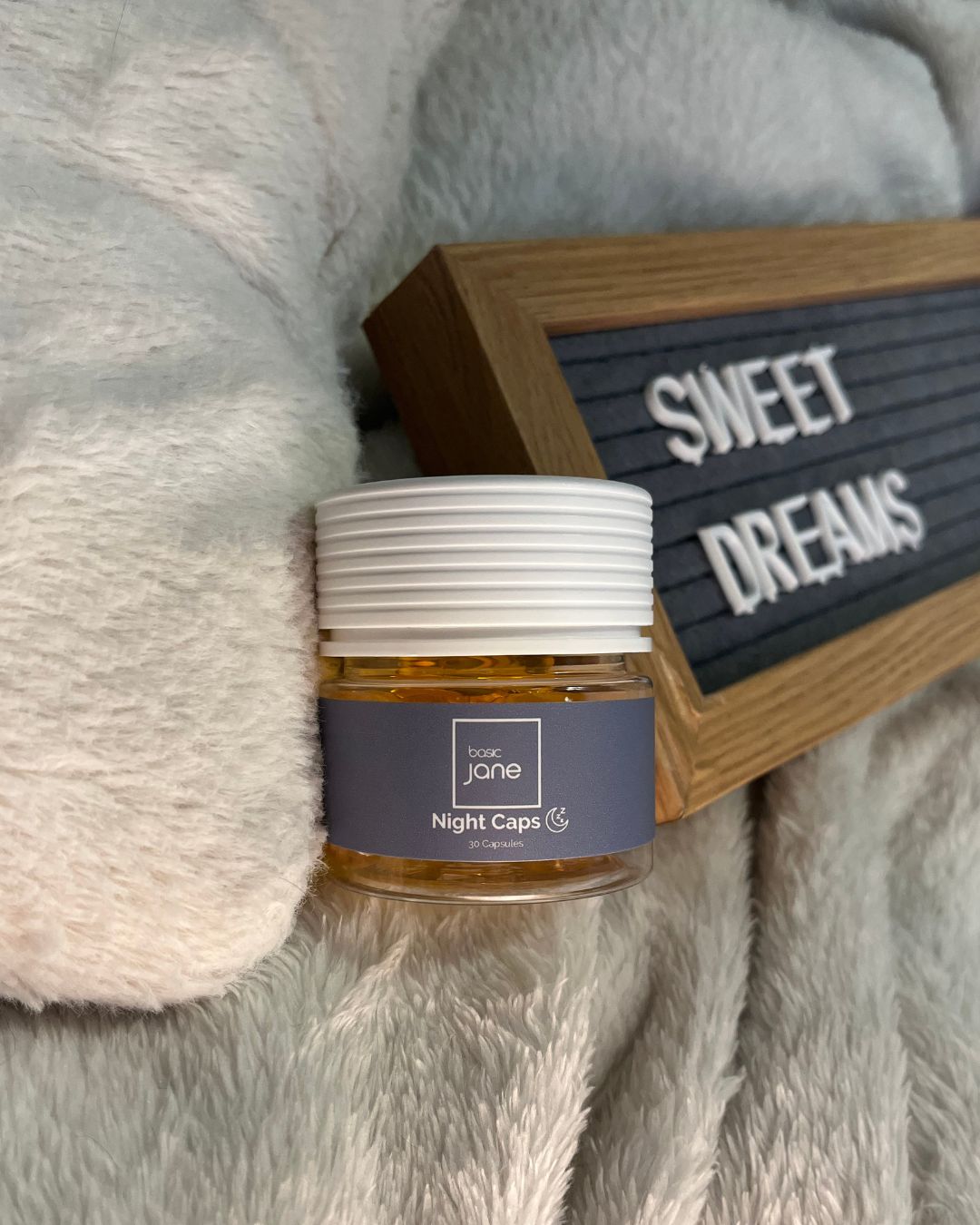 Clinically Inspired, Naturally Effective Sleep Support. Drift into deep, restful sleep with Basic Jane Night Caps, a thoughtfully crafted blend of Hops, Valerian Root, and Passion Fruit, designed based on clinical research into natural sleep enhancers. Each capsule harnesses the calming power of botanicals to help you unwind, fall asleep faster, and wake up refreshed—without grogginess.