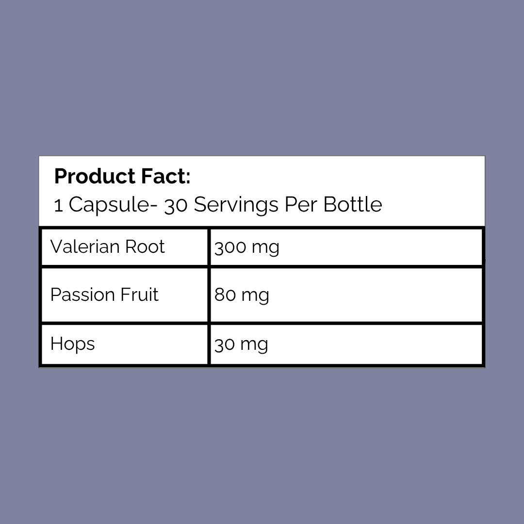 Ingredient List: Fractionated MCT Coconut Oil, Valerian Root Powder, Passion Fruit Extract, Hop Extract, Gelatin, Vegetable Glycerin, Purified Water.